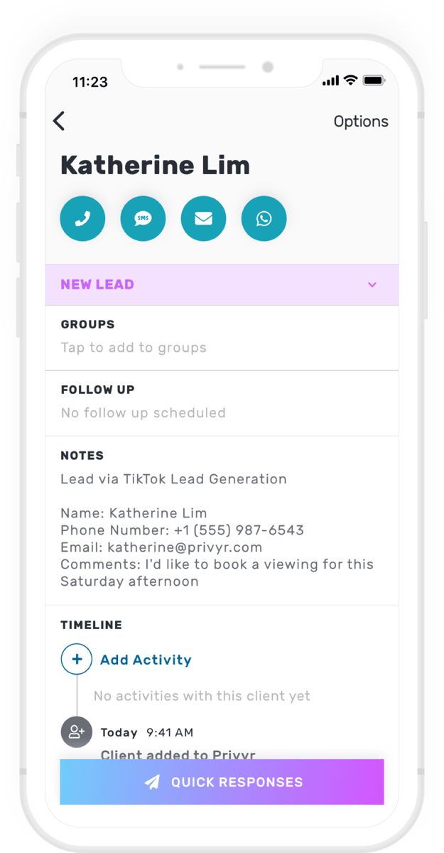 Privyr is built for sales and marketing professionals who receive and manage leads from TikTok Lead Generation. It works with WhatsApp, SMS, iMessage, email, and phone calls.