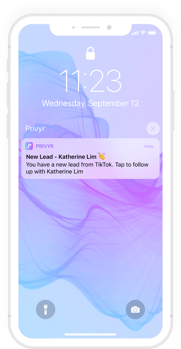 Get your TikTok leads delivered instantly via email and the Privyr app. Tap to immediately view the lead’s contact information, custom answers, and campaign & ad details.