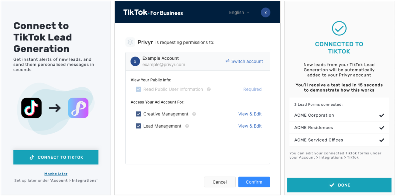 Connecting your Privyr account to TikTok is super easy. Simply log in, check the boxes to grant permissions, then click confirm - that’s it!